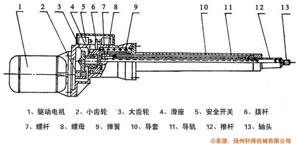 電動(dòng)推桿由驅(qū)動(dòng)電機(jī)、減速齒輪、螺桿、螺母、導(dǎo)套、推桿、滑座、彈簧、外殼及渦輪、控制開(kāi)關(guān)等組成。