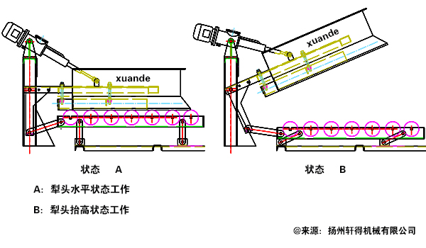 電液動犁式卸料器以電動液壓推桿為動力源,工作時,通過推桿伸縮作用于驅動桿,帶動框架前進,完成犁刀下落,并支撐起平托輥組,使膠帶工作面平整,犁刀下沿與膠帶面貼合緊密,將運行膠帶上的物料卸入漏斗中,或卸到需要的場所去;卸料結束時,啟動推桿縮回作用于驅動桿,帶動框架后退,犁刀上抬,使膠帶工作面恢復槽型狀態,讓物料平穩通過;由于電液推桿采用液壓傳動,具有自動過載保護性能。當運行受阻時,油路中壓力增高到設定的限額,溢流裝置迅速而準確的溢流,實行過載保護功能,電機不會損壞和燒毀。